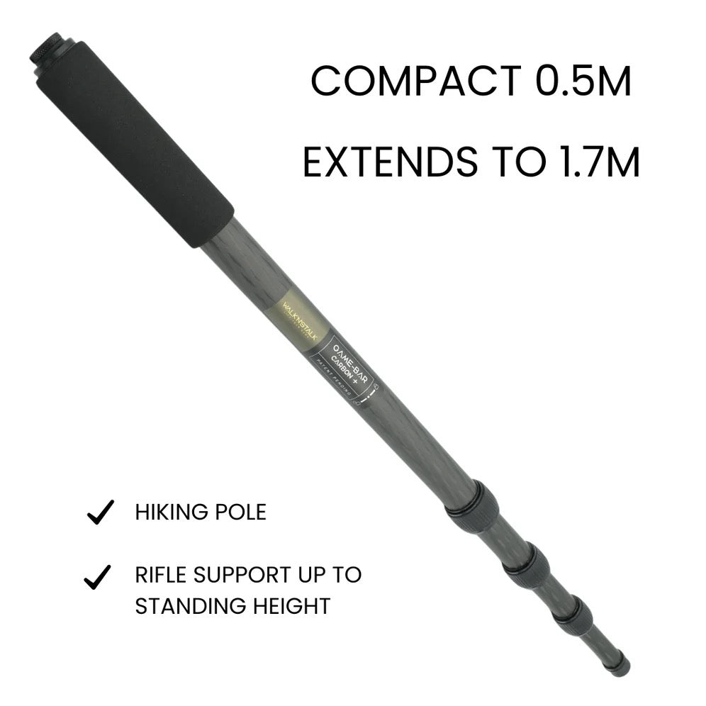 This lightweight, high-country-ready system for hunters who demand both a trekking pole and precision on the shot. The GAME-BAR® CARBON+ TREK & AIM combines the ultralight strength of the CARBON+ bar with all-terrain TrekTip™, the stability of the V-Rest, and the versatility of the GearSync™ adaptor — giving you the confidence to climb higher, aim steadier and hit your mark.